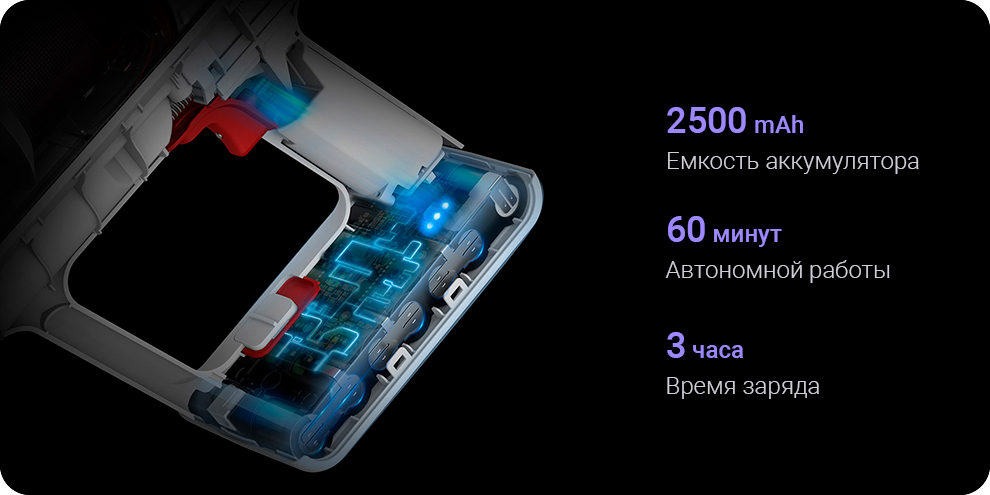 Работает пылесос от аккумулятора мощностью 2500 мАч. Полного заряда батареи хватает на 60 минут автономной работы на маленькой скорости. Полностью же заряжается батарея за 3 часа. Это, а также небольшой вес и компактные размеры делают представленный пылесос одной из лучших портативных моделей.