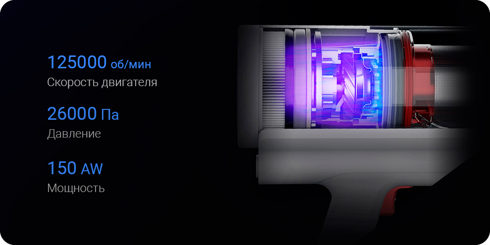 Мощность всасывания пылесоса – 26 кПа, а его электродвигатель работает на скорости 125 тысяч оборотов в минуту. Этого вполне достаточно, чтобы качественно вычищать грязь даже из швов и небольших щелей.