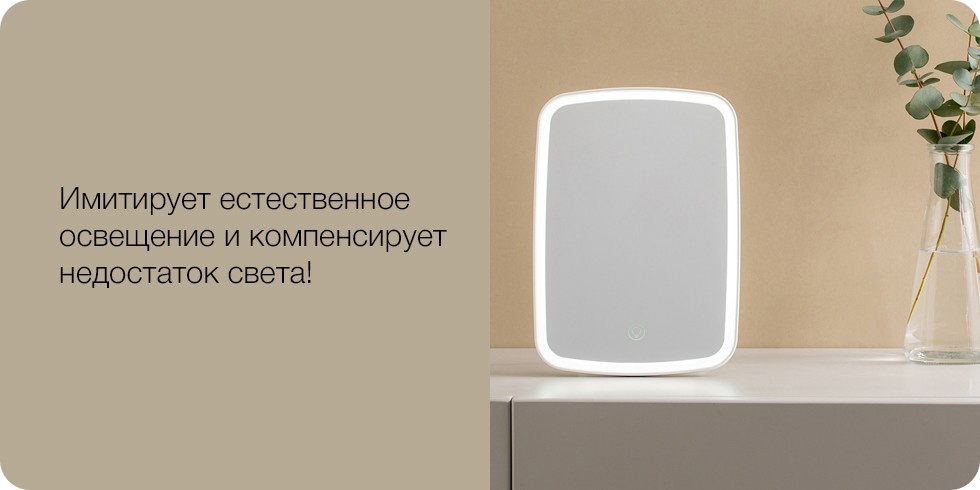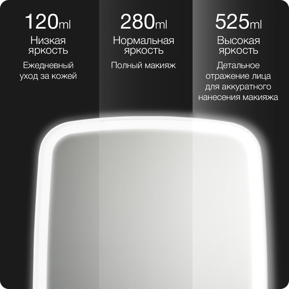На зеркале равномерно располагаются 33 светодиода, которые способны имитировать характеристики естественного освещения и компенсировать недостаток света в помещении. Интенсивность освещения составляет 525LUX, что обеспечивает более высокую четкость изображения по сравнению с обычными зеркалами. Мягкий свет не раздражает глаза и не вызывает дискомфорта, кроме того, светодиоды не дают бликов.